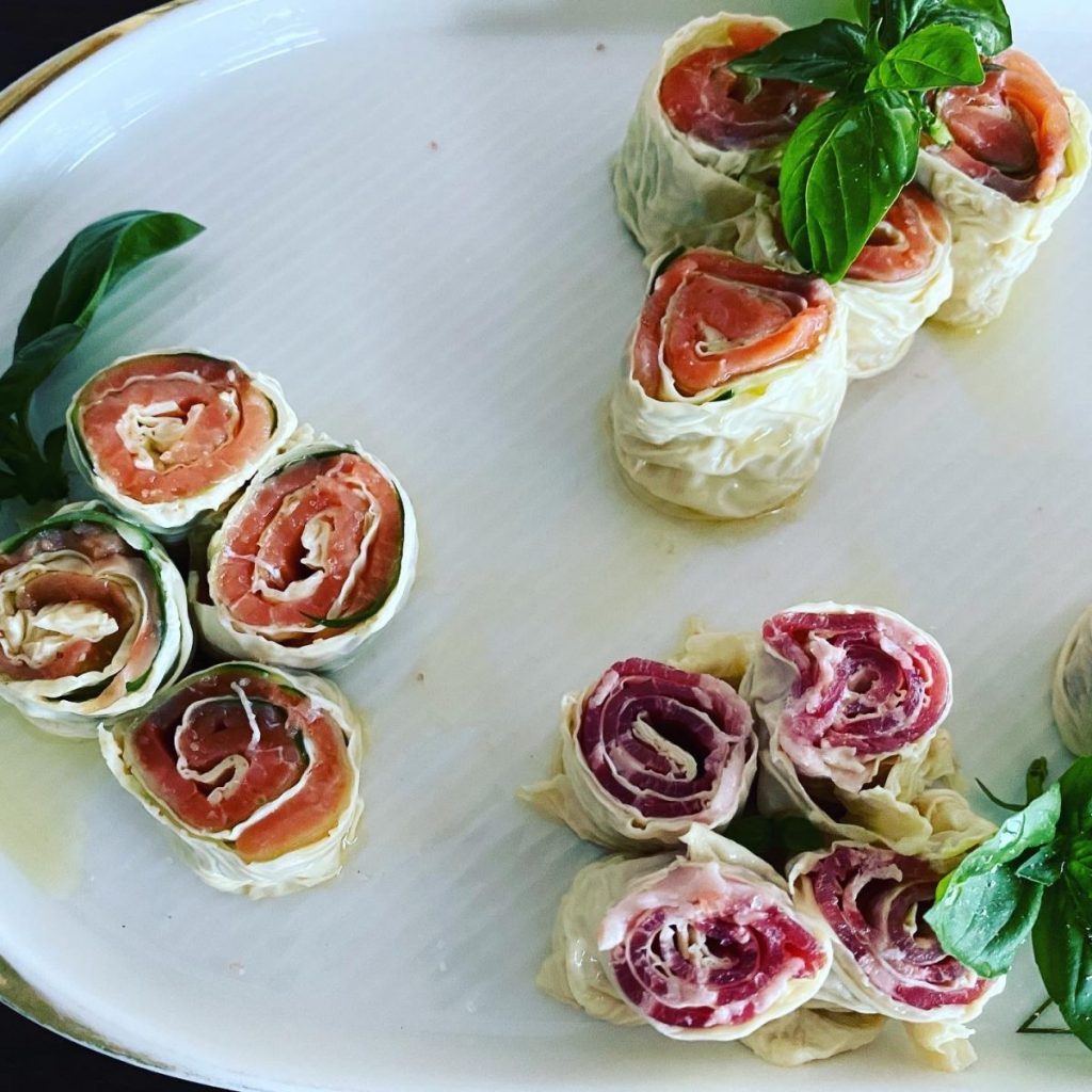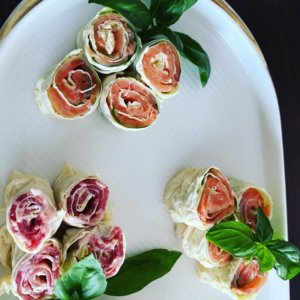 おうちパーティーや持ち寄りに最適、簡単だけど美味しくて、映えるレシピ。レシピといっても、ただ釜揚げ湯葉にサーモンや生ハムを乗せて巻くだけ。バジルを添えて。味付けは岩塩とオリーブオイルだけ。