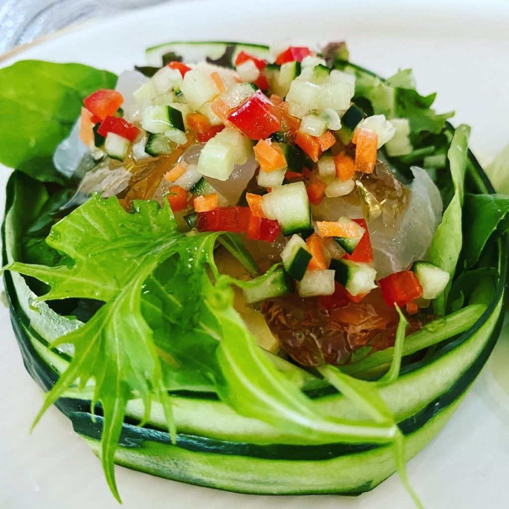 お刺身湯葉を小さくカットして、マグロやサーモン、鯛のお刺身と組み合わせて、前菜に。湯葉を入れることのメリットは・・・満腹感が半端ないです。やはりダイエットに最適。また、食事に大豆イソフラボンを取り入れることができるので、