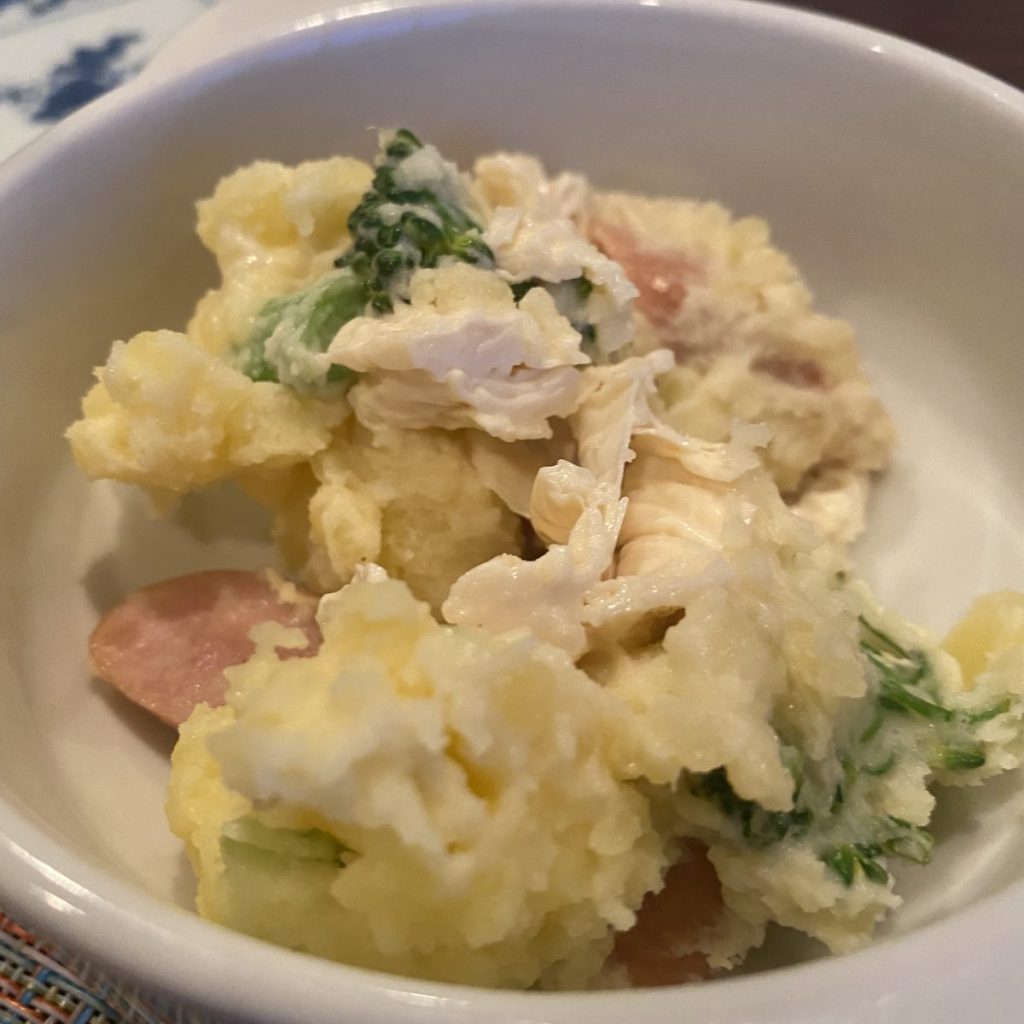 特に工夫したわけではなく、よくある普通にポテトサラダを作って、お刺身湯葉を入れてみると・・・!食感や風味が変わって、高級ポテトサラダになります!お刺身湯葉とマヨネーズの組み合わせもとてもよく合います。